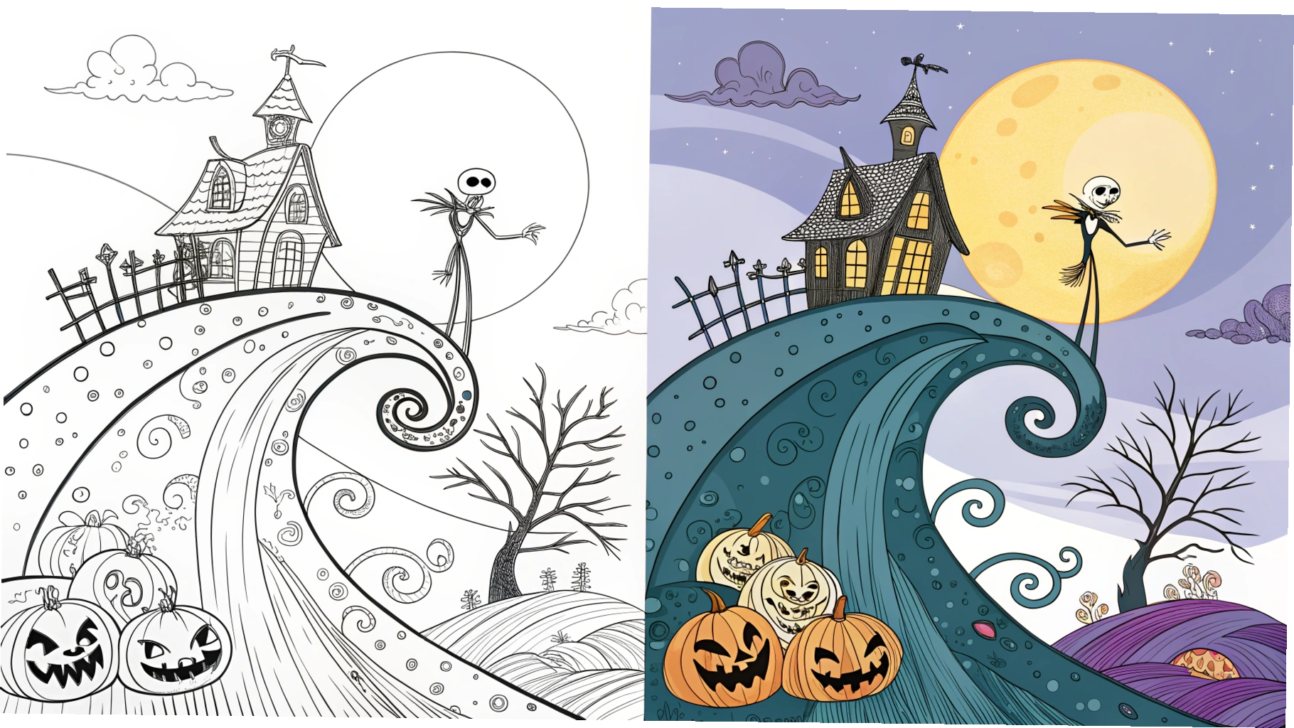 Jack in his element as the Pumpkin King provides some of the most dramatically beautiful coloring opportunities. These scenes often feature the spiral hill, full moons, and the twisted architecture of Halloween Town.