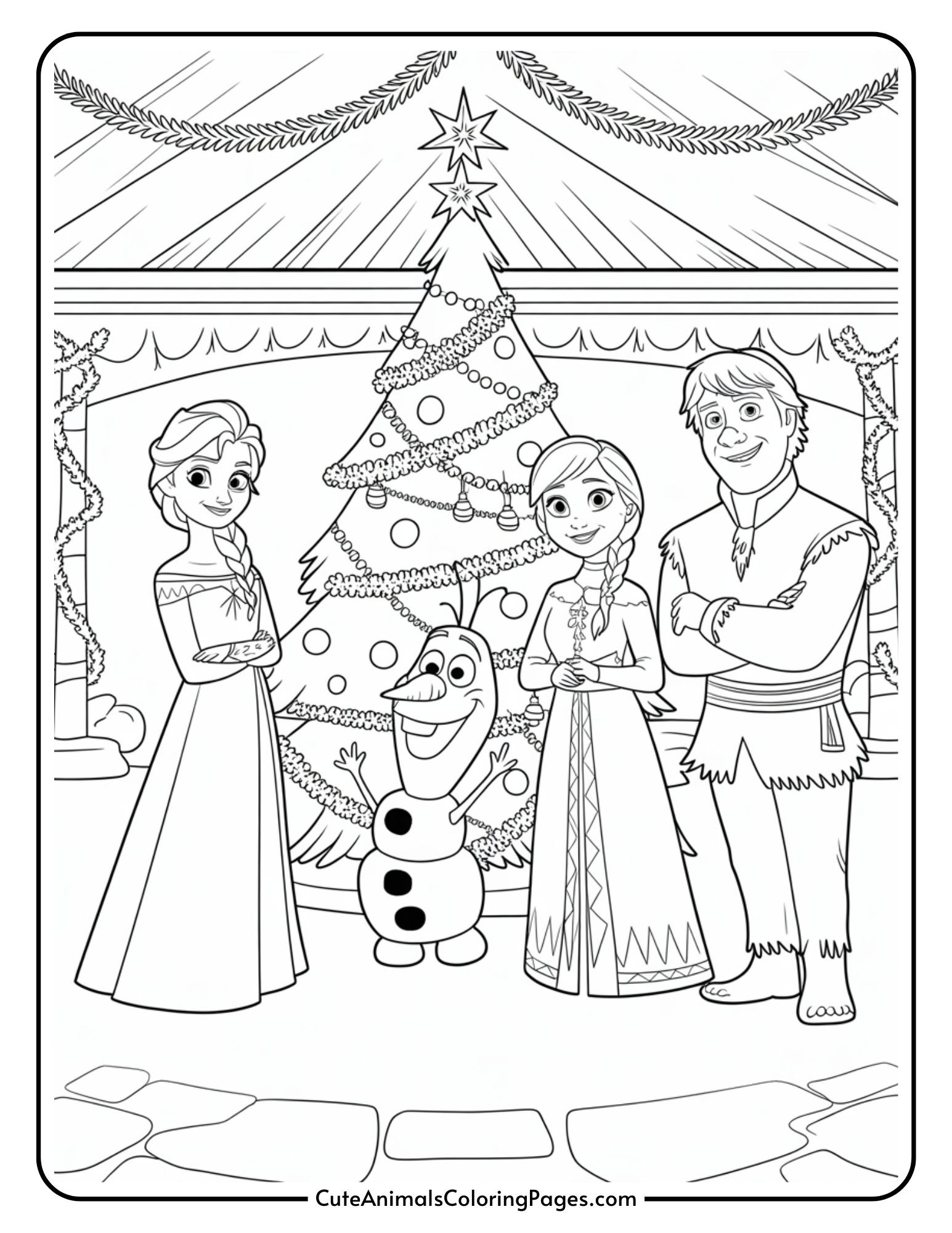 A coloring page featuring four characters from a popular animated series, standing in front of a decorated Christmas tree. In the scene, there are two female characters dressed in snow, and a male character in winter clothes. The room is decorated with garlands and festive decorations.A coloring page featuring four characters from a popular animated series, standing in front of a decorated Christmas tree. In the scene, there are two female characters dressed in snow, and a male character in winter clothes. The room is decorated with garlands and festive decorations.Needle
