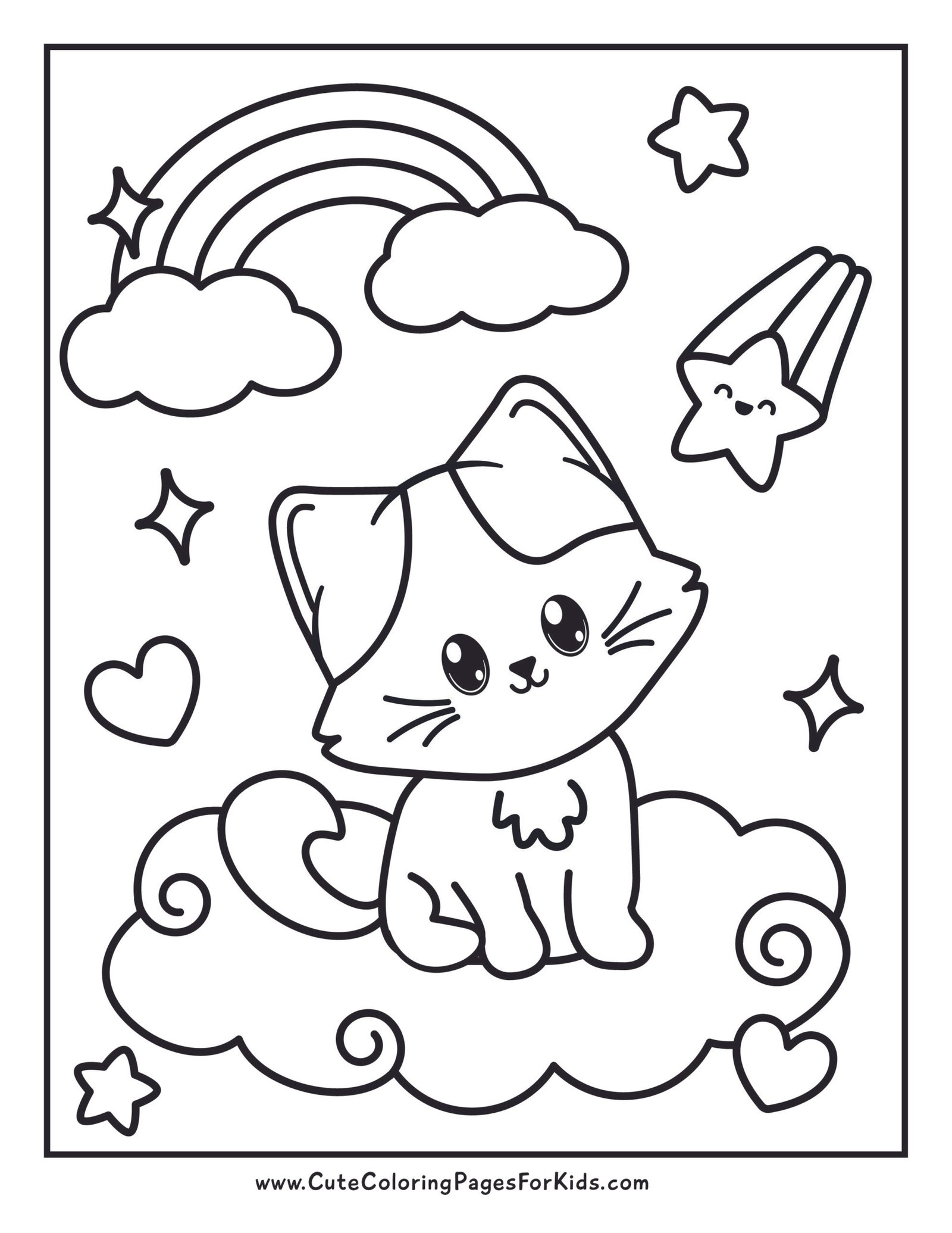 This is a lucky kitten, visited by a rainbow, heart and twinkle shooting star.