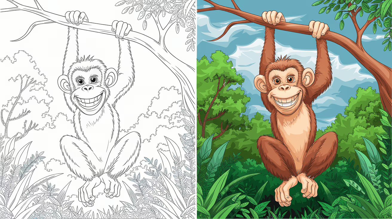 For a layered effect, color the monkey on one page, cut it out, and place it against a colored background of leaves or trees. You can even use pieces of colored paper to make a 3D collage effect, making the monkey seem to stand out from the jungle background.