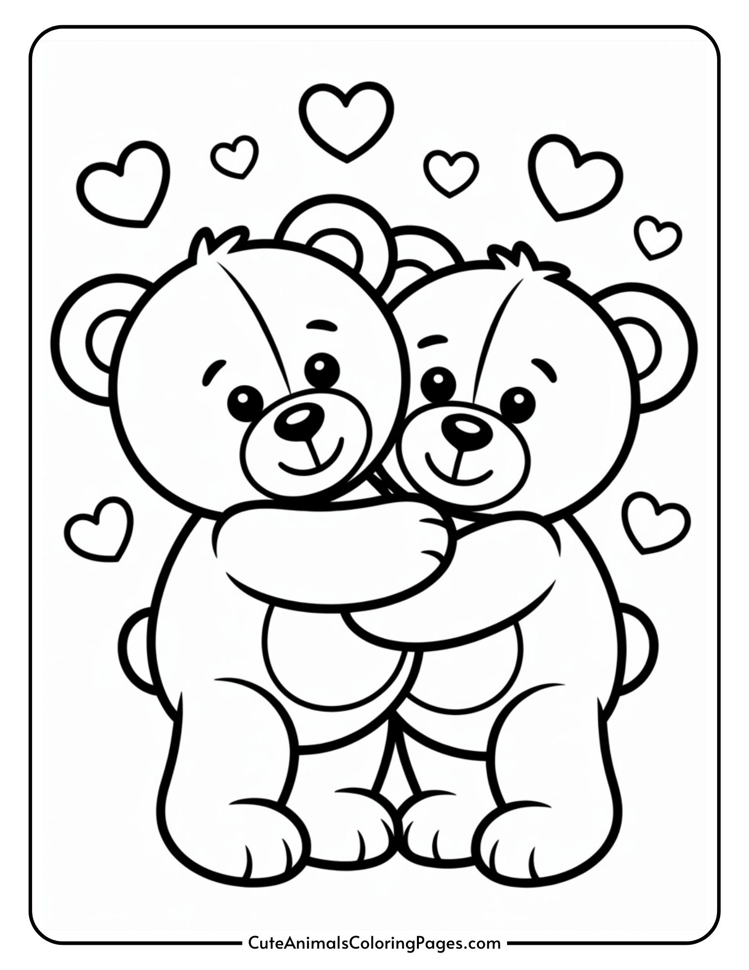 These adorable teddy bears feel extra sweet for Valentine’s coloring fun, and they’re still kid-friendly while keeping the style soft and playful. Two bears holding hands, sharing a heart, or sitting together make a sweet Valentine photo! I love these pages for siblings too. Sometimes I’ll print the same page twice, and they color them differently, then compare details like matching hats or different heart shapes!